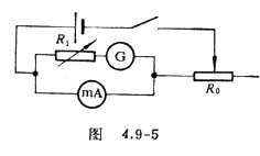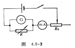 4.利用本实验的器材,也可以用替代法测检流计的内阻。如图4.9-5连成电路,R1、R0阻值在开关闭合前都调至最大。开关闭合后调节R0和R1,使毫安表和G表指针都接近满偏转。记下毫安表读数。用另一电阻箱R2代替G表接入电路,并调节R2使从零逐渐增大(R1、R2的值应保持不变),直至毫安表示数与G表接入时相等。则此时R2的值就等于G表内阻。