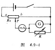 2.若所用变阻器阻值偏小,用图4.9-3所示电路,调R0不能使电路电流小于、等于改装表 的量程,则可采用图4.9-4所示电路求改装表的百分误差。此时应注意在开关闭合前将滑片P调到b端。