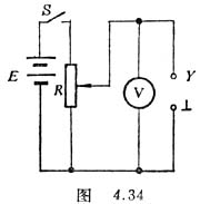 1.按图4.34接线,电源电压取2伏,滑动变阻器的滑片与一个固定端分别接到示波器的Y输入和公共接地端旋钮。扫描开关置于外X