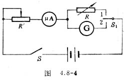 替代法测电表内阻的原理如下:按图4.8-4接好电路,G为待测内阻检流计,μA为以微安为单位的标准电流表,简称做安表,R为电阻箱。实验时,闭合S,S1接2,调节滑动变阻器R′的阻值,使G的指针转到满刻度,记下微安表的读数,这即是< SPAN lang=EN-US>G表的满偏电流值Ig。再将S1改接到1,使R′的阻值不动,调节电阻箱R的阻值,使微安表的读数仍为Ig,这时电阻箱的阻值即为检流计G的内阻。