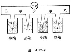 6.在找不到合适的电压表,又要提高实验的精度,可以把几个温差电偶串联起来,测其总电动势,如图4.32-2所示。