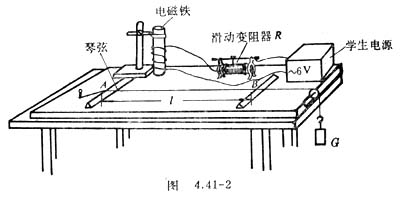 按图4.41-2装好器材,电磁铁支在适当的支架上,使它在水平方向距三角支座A约80-100毫米,竖直方向距琴弦2