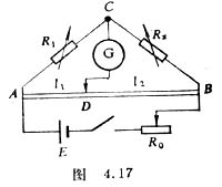 (3)将检流计改接为“0-G0”挡,瞬时按下滑动头,这时又会发现检流计指针又有微小的偏转。按上述方法,微微移动D的位置,找到电桥这时的平衡点。
