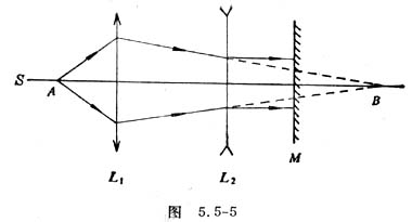 2.保持“1”字屏及L1位置不动,在L1和光屏之间装上待测焦距的凹透镜L2和平面镜M,并使L2与L1等高同轴,如图5.5-5。