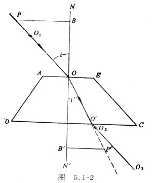 取走玻璃砖,连直线O1O、O2O3,延长O3O2交DC边干O′,连OO′。过点O作AE的垂线NN′,则O1O为入射光线,OO′为折射光线,ON为法线,∠O1ON为入射角i,∠O′ON′为折射角i′,如图5.1-2所示。