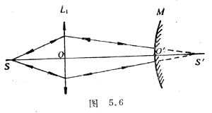 如图5.6所示,凸透镜L1使光源成像在S′处。将凸面镜M置于S< /SPAN>′与凸透镜L1之间,如凸面镜M的曲率中心恰好与S′重合,则由L1出射的光线一定是沿凸面镜M的半径方向入射到凸面镜上,其后也一定沿入射方向返回。由光路可逆性可知,凸面镜M反射回的光线经凸透镜L1折射后一定成像于光源S处。所以只要光源S发出的光经L1折射、M反射,再经L1折射又成像于S上,则S′一定为凸面镜的曲率中心,其焦距f=1/2R,R=(OS′-OO′)。