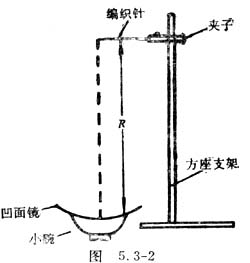 2.在上述凹面镜和小碗旁边放一方座支架,支架上水平地夹持一根编织针,编织针上系一根小的重垂线。用手将重垂线移至针尖附近(不使其脱落),调整支架位置,使小重锤位于滚珠之上,目的是要使编织针针尖大体上位于滚珠球心的正上方。然后取走重垂线和滚珠,实验中不能再移动方座支架和凹面镜,这时编织针针尖正好位于凹面镜的主光轴上,如图5.3-2所示。