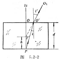 当我们在空气中观察水中的物体时,由于光线的折射,物体的像的位置会比物体的实际位置高,我们简单地说物体的位置升高。同样在空气中观察玻璃中某物时,其位置也会升高,如图5.2-2所示。在厚度为d折射率为n的玻璃下底面上有一点P,在空气中沿着O1O′的方向观察时,P点的位置在P′,升高了h,根据折射定律nsini/sini′。从图中可知