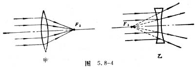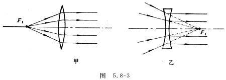 在透镜光轴上某点发出的光线,通过透镜折射后平行于光轴,该点称为透镜的第一焦点,也就是说,当物体放在透镜的第一焦点处,通过透镜成像在无穷远,如图5.8-3所示,其中图5.8-3甲图为凸透镜的第一焦点,乙图为凹透镜的第一焦点。