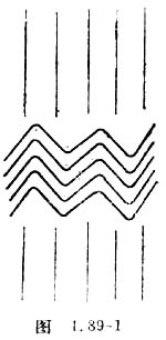 取曝过光的135型胶卷的黑底片,放在玻璃板上,用刀片沿直尺在胶片上划一条细缝,然后不移动直尺,将刀口稍微偏一点,再划一条细缝。或者将两张保硷刀片并拢,以刀的前端沿直尺在胶片上一次划出两道细缝。再一种方法,也可取一小块玻璃片在上面均匀涂一薄层黑墨汁(最好不用烛焰上熏的烟黑,因烟灰颗粒大,划出缝太宽),待干后再用刀片以同样方法划出两道透明狭缝。缝间距离要小于1/10毫米。观察时将带缝的板横放在眼前,通过双缝观看相距半米左右的白炽灯的灯丝,可看到在灯丝两侧细密分布着彩色的干涉条纹(如图1.89-1)。缝离灯越近,细密的干涉条纹越清晰。