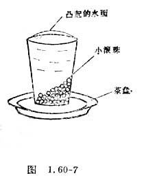 找一个玻璃杯或大口瓶,放在茶盘里,灌满水后,手拿自行车上的小滚珠或壹分硬币,顺着杯子的边缘,放入杯中,你会发现杯中已装入数十粒滚珠或近二十余个硬币后,尽管水面高出杯口,堆起来很高,呈现向上凸起的形状,但仍不溢出来(如图1.60-7所示)。