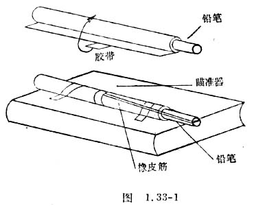 找一张纸,上面画一只猴子,纸的下端卷入一根自行车钢丝,用胶水粘牢。再用另一张纸按图1.33-1所示的方法卷一根“枪管”,用胶带贴牢在书本的硬封面上(或木板上),纸筒的中部绑扎一根橡皮筋圈,用以发射铅笔“子弹”。