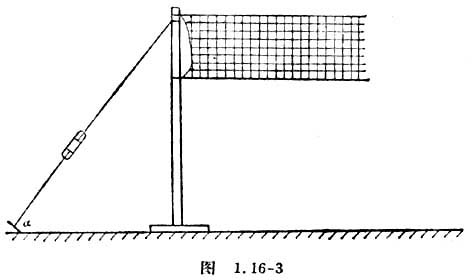 用上面的实验方法,你还可以分析活动式羽毛球网架(图1.16-3)或侧向拉线的电线杆的受力分解情况。想一想,侧向拉线的角度a大些好,还是小些好?