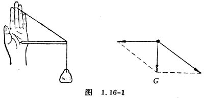 (1)用线的一头系一重物,另一头系在中指上,再用一支铅笔支起重物,笔尖支在手掌上,如图1.16-1所示。感受中指和手掌的受力方向。