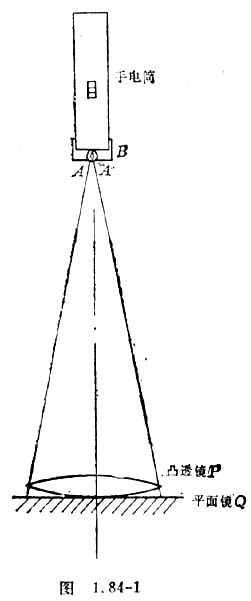 (3)晚上,取一平面镜Q水平放置在桌上,把放大镜P放在它的上方,并用手电筒灯泡A作光源。实验时,去掉手电筒前面的玻璃罩盖,在灯泡上套一小纸筒B,让光由上而 下照射透镜,见图1.84-1。上下移动A,见入射透镜P的光经平面镜Q反射后再入射P最后在A附近的屏上成像A′。微微移动A,当A′与灯泡A几乎重合时,测得AP之间的距离即为凸透镜P的焦距f。