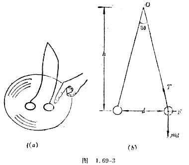 用丝绸摩擦唱片,使唱片带电。把用绝缘丝线吊着的两个小薄纸片放到唱片上,用手指分别接触一下两个小纸片,使它们感应起电,如图1.69-3(a)所示。提起丝线,两纸片因带同种电荷而相互排斥,使丝线张开一个角度,如图1.69-3(b)所示。从这个实验你可以估计出纸片上带的电量。在图1.69-3(b)中,纸片受的重力为mg,受到的静电斥力F,两根丝线的张角为2θ。当纸片平衡时