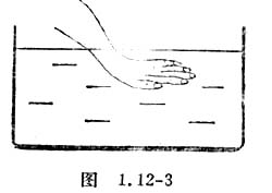 如果你把手伸到水中去,并不与容器底接触,会不会对容器产生向下的压力?这对你来说,也许是难于想象的(如图1.12-3)。手浸入到水中,必然受到水对它的浮力,但浮力的反作用是什么力呢?根据牛顿第三定律,作用与反作用是分别作用在两个物体上的,并且性质相同,由此可知,浮力的反作用应当是手对水的压力,这可以通过下面的实验看出。