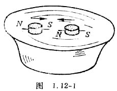 取两根钢针,将其中的一根通过在磁铁一极上沿针尖方向摩擦而磁化。把这两根针各穿在一只软木塞上,再放入水盆中,你可以看到,它们彼此相互吸引而靠拢,如图1.12-1所示。