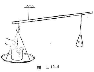 把盛着水的杯子放在杆秤的盘中,调节秤砣的位置使杆秤平衡,然后把几个手指放进水中,杆秤就不再平衡,如图1.12-4所示。它证实了浮力的反作用力的存在。如果使手浸入水中的体积变大,杆秤愈加不平衡,显示了浮力变大,其反作用力也随之变大的现象。