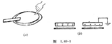 圆盘带电是静电感应的作用。用丝绸摩擦唱片后,唱片带上了负电。由于静电感应,圆盘接近唱片的一面带正电,另一面带负电。用手接触圆盘时,负电荷被排斥到最远端(地下),这样圆盘就带上了正电,如图1.69-1(b)所示。