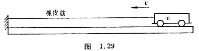 实验2:把小车放在桌面上,使板面一端略高,以平衡摩擦阻力,用一根比较长的橡皮筋拉住小车,使橡皮筋伸长到一定程度后释放小车(图1.29),观察小车运动快慢的变化。你会发现,随着小车前进,橡皮筋缩短,表明它对小车的拉力也变小,但小车的速度仍然是越来越大。