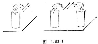 把蜡烛点燃,如果你对着烛焰吹气,火焰将向着气流的方向偏倒,但是你向着烛焰的一侧吹气,或者向两支蜡烛火焰的中间吹气,你会发现,火焰将向着气流的一侧倾倒,如图1.53-1所示。这是由于流速大处压强小的缘故。