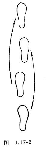 孩童学步踉踉跄跄经常跌倒,你该会解释了吧。但是,你可留意过学步的小孩行走时两脚总是叉开的吗?在行车时汽车上的售票员或航船上的水手,他们站立时(不扶靠物体),双脚也总是叉开的,走步都是八字形,这都是为什么呢?而舞台上的演员,走步时又多是一字形的,如图1.17-2所示,可显得体态优美,婀娜多姿,你能说说这又是什么原因呢?请你画出用八字形和一字形走步时两脚着地构成的支面大小,再从支面的大小与稳度的关系上去回答它。