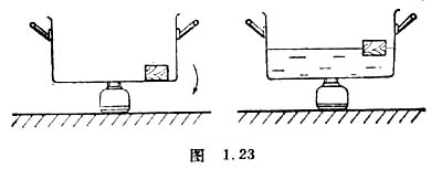 实验中你会发现,无论木块漂浮在哪里,铝锅都不会倾倒,如图1.23所示。原来,根据阿基米德原理,物体所受浮力的大小等于它所排开的液体所受的重力,又根据牛顿第三定律,浮力的大小等于物体对液体施加的压力。因此,木块对液体的向下的压力等于它排开液体所受的重力。由此可知,铝锅不会倾倒。