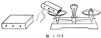 每一种秤都有它的称量范围,超出这个范围的物体,一般情况下是不能直接称出其质量的。这里就必须动动脑筋,在那根长棉线上做文章。方法是:从长线上截下一段与词典等长的线,一折二,二折四,在词典上标出二分点和四分点。然后将词典的一边搁在托盘上,用手指支在标出的那些分点中的一点上,在天平的另一托盘上放适量砝码并移动游码使天平平衡,如图1.13-2所示。这时,对手指的支持点来说,由书所受的重力mg和托盘对书的弹力N′产生的力矩几乎是平衡的,即