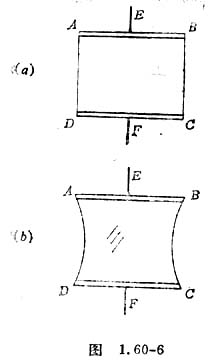 4.把它插入皂液中,当提出时,框架上便有一层肥皂膜,这时可以看到橡皮筋向内部弯曲,如图1.60-6(b),再用卷尺记下弯曲后皮筋的长度。
