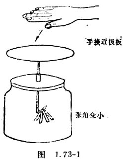 在验电器的金属杆上装一只小圆板(可以用纸板),给圆板带电,验电器的箔片张开一定的角度。然后用你的手掌去接近圆板,你会发现,箔片张角变小了,如图1.73-1。当手掌移远时,张角又变大。如何来解释这一现象呢?