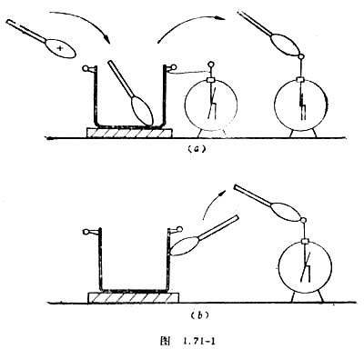 把铝锅放在石蜡块土,用感应起电的方法使起电盘的金属盘带电,再把带电的金属盘放到铝锅内与锅底接触,你可以看到与铝锅外表面相连的验电器的箔片张开了。这表明已有电荷传递到锅的外表面上。手持金属盘绝缘柄,将盘从锅内拿出,再与另一验电器接触,验电器的箔片并不张开,说明金属盘上的电荷已全部传递给锅。然后你用带绝缘柄的金属盘与锅内表面接触,取出后再用验电器检验一下.你会发现它不带电。将金属盘与外表面接触,再加以检验,验电器的箔片就张开了,实验过程如图1.71-1所示。它说明静电平衡时电荷总是分布在导体外表面上。这与装水是完全不同的。