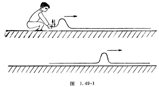 取一根3-4米的长绳,呈一直线地放在地上。你蹲下,握住绳子的一端,迅速地向上一抖,再复原位,可以看到一个凸形的“脉冲”沿绳方向传播出去,如图1.49-1所示 。之所以产生这样的现象是由于振源的质点偏离平衡位置,促使相邻的质点相继偏离平衡位置而形成的。实验说明了波的形成、传播和横波的特点。如果手不再抖动,“脉冲”传过之后,原位的质点很快平静下来,它说明波动是伴随着能量传播的,要维持波的传播,必须不断地给振源提供能量。