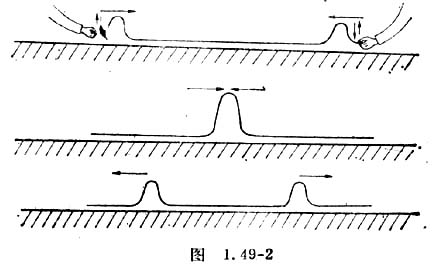 用抖长绳的方法还可以说明两列波传播的独立性特征和波的叠加原理:两个人各握长绳的一端,同时向上一抖,可以看到两个凸形“脉冲”相向传播,在中间相遇后又相背传去,彼此是独立传播的;在中间相遇时,变为一个大的凸形“脉冲”,其幅度为两个独立“脉冲”的幅度之和,如图1.49-2所示。如果绳子一端向左一抖,另一端同时向右一抖,左、右两个“脉冲”相遇时则出现相互抵消的现象,中点几乎不动,相遇后又以独立“脉冲”向两边传去。