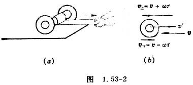 实验时,把长纸条卷在纸轮轴的轴上,把轮轴放在桌上,且使纸条的一端从轴的下方伸出,然后用手迅速地水平拉动纸条,如图1.53-2(a)所示。纸轮轴被拉出后一边旋转,一边向前上方偏折。为什么会出现这种现象呢?原来纸轮轴被纸条拉动时,一方面轮轴质心获得水平方向的速度v′,一方面轮轴绕质心以角速度ω逆时针旋转。在轮的下方,由于转动所带动的气流速度(ωr)方向与相对纸轮质心平动的气流速度v方向相反,而在轮的上方,由于转动所带动的气流速度方向与相对质心平动的气流速度v方向相同,因此下方流速(v下=v-ωr),而上方流速(v上=v+ωr)大,如图1.53-2(b)所示,于是纸轮下方的气体压强比上方的大,从而使纸轮向上偏转。
