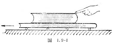 把几支圆杆铅笔平行地放在桌面上,再把两本书放在铅笔上,如图1.9-1所示,用手向前推上面的一本书,你会发现,下面的一本书也会跟着一起前进。显然,以地面为参照物,对下面这本书来说,它受到上面的书对它的摩擦力就是一种动力。