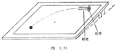 如果在斜面上铺张纸,让弹子表面蘸上墨水,再将它从斜槽上滚入斜面,你可以看到运动留下的轨迹,如图1.34所示。如果铺在斜面上的纸很粗糙,按适当方向放置铅笔斜槽,你还可以看到类似斜抛的弹道曲线的轨迹。