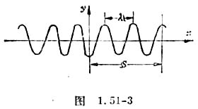上述公式是怎么得来的呢?过中心O作水波的纵截面图,如图1.51-3所示,根据测定方法可知,波长为λ,水波的频率f=N/t′,水波的波速v=λ(N/t′)。