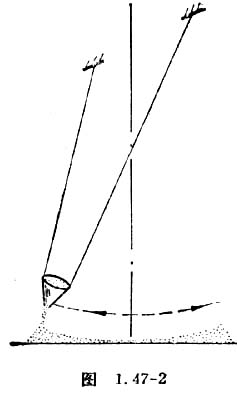 用硬纸板卷一个漏斗,再用两根线吊起来,悬挂在两个椅臂之间。往漏斗中装沙子,用拴线的火柴棒堵塞漏斗口,然后使沙摆振动起来,随即用线把火柴棒拉出,沙在振动过程中不断漏出,在地上堆积起来。你可以看到,在接近平衡位置的地上沙堆积的很少,而在接近最高点的地上沙堆积得很多,如图1.47-2所示。这说明摆在振动过程中速度是在不断变化的,在平衡位置速度最大,越接近最大位移处速度越小。