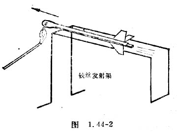 实验时,把小火箭放在铁丝架上,点燃一根火柴,对准铝箔筒包有火柴头的部位加热,当温度升高到火柴头的燃点时,箔里的火柴便被点燃,使周围的空气急剧膨胀,气体从尾口高速喷出。由于反冲作用,火箭筒便从架上向前飞了出去。如图1.44-2所示。