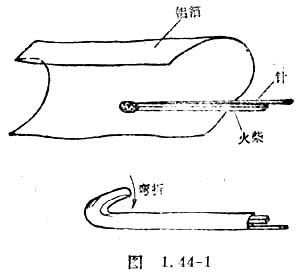 将一根火柴和一根缝被的大针并在一起,用包香烟的铝箔将它们紧紧地包裹起来,再将有火柴头的一端的铝箔弯折过来密封捻紧,如图1.44-1所示。然后在靠近尾部的地方装上定向尾翼,把针拔出,就成了一个很简单的反冲火箭。