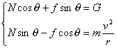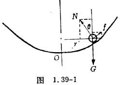 是什么力维持弹子在锅壁上作圆周运动呢?图1.39-1描绘了弹子的受力情况,弹子在离锅的中心轴半径为r的地方,受重力G、支持力N 和摩擦力f的作用。将这些力沿竖直方向和水平方向分解,可以建立稳定旋转时的两个方程: