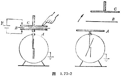 在验电器的金属杆上固定一块金属板A(如图1.73-2),把唱片B放在A上,带绝缘柄的金属板C放在B上,则A、B、C组成一个有介质的电容器。