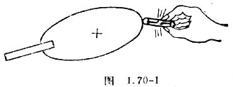 氖管放电时,你会注意到只有一极起辉,起辉的这一极相对另一极为低电势极。例如,手持的一极起辉,说明另一极的电势高于手持极的电势,即比地的电势高。由此可以判断,与另一极接触的带电导体必带正电,如图1.70-1所示。