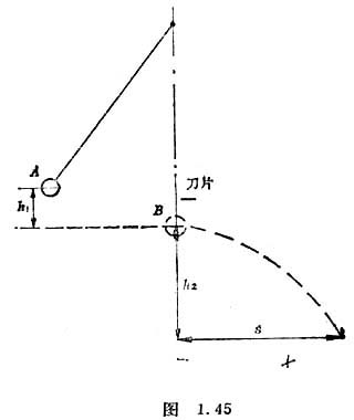 如图1.45所示,用细线拴住铁球或石块作成摆,将摆线悬挂在墙上的钉子上。实验时,请一同学将摆球偏离平衡位置B,测出小球在A点处升高的高度h1。另一 同学手持刀片置于平衡位置略上一点的地方。释放摆球,当摆球经过平衡位置时,摆线被刀片割断,小球即作平抛运动。在地面事先放置的白纸和复写纸上打下落点的痕迹,测出射程s和抛出点离地面的高度h2。根据平抛运动的规律可知,小球在B点时的速度vB可这样求出: