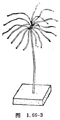 验电羽可以这样制作:取出拆开的纸介电容器中的层间薄纸(15-20厘米长),放在玻璃板上,用双面刀片沿直尺边把它划成2-3毫米宽的长条,纸的一端可以不划断,使20-30根纸条连在一起,然后将连着的这一头绑在自行车辐条的固定在车轴的那一端,再把辐条的另一端插在泡沫塑料底座上,就做成了一个很灵敏的验电羽。一旦使辐条带电,验电羽就张开了,如图1.66-3所示。