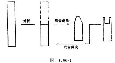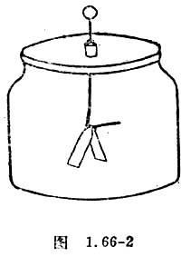 取带塑料盖的广口玻璃瓶(装水果罐头的玻璃瓶)作验电器外壳;用干净的塑料薄膜卷在一段圆珠笔芯上制成绝缘塞;再用一段硬导线或铁丝,弯成“L”形,穿在绝缘塞中,作验电器的金属杆,在杆的上端弯成一个圆环。验电器的箔片可以用笛膜,或从废的电容器中取出的层间纸膜,剪成如图1.66-1所示的形状,粘在L形金属杆下端的水平部分。装配结果如图1.66-2所示。做好后思考下列问题:如何用验电器来检验物体是否带电?如何用它来比较带电体所带电荷的种类?