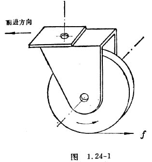 仔细观察你就可以发现,这些轮子有两个固定的转动轴:一个是轮盘的水平转轴,一个是轮架的竖直转轴。并且这两个转轴不在同一平面内,即它们互不相交,如图1.24-1所示。如果箱体沿图所示的方向前进,轮架的竖直轴就在轮盘的平面内,地面给轮子的摩擦力f对竖直轴的力矩也就等于零,因此轮子不会偏转。如果人们推动箱体迫 使它转弯,那么地面对轮盘的摩擦力的作用线也就不再通过竖直转轴。图1.24-2为从上向下看的俯视图,箱体右转时,产生侧向的摩擦力f。它对竖直轴的力矩使轮架转动,直至轮盘的平面与运动方向的夹角为零。
