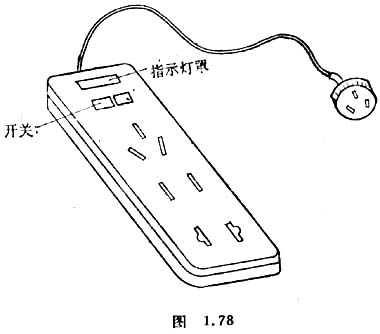 请准备一只塑料的多用接线板(外形如图1.78),这种接线板有如下功能:(1)当插头插市电插座以后,接通插线板上的开关氖泡指示灯发光(氖泡的工作电压小于220伏,约70伏);(2)接线板上有三个插座,二个插座是两孔的,一个插座是三孔的。