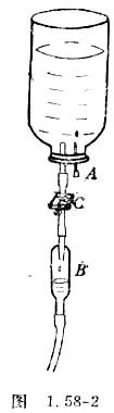 注射医院的护士常给脱水的病人静脉注射盐水葡萄糖溶液,俗称“挂吊针”。请观察它的装置(图1.58-2),说说为什么盐水瓶在倒挂时,总要向瓶里插一根注射器的针头A,让空气断续冒泡地进入瓶内?橡皮管连接的“滴管”B和管上的夹具C又有什么作用?请分析注射液稳定的原因。